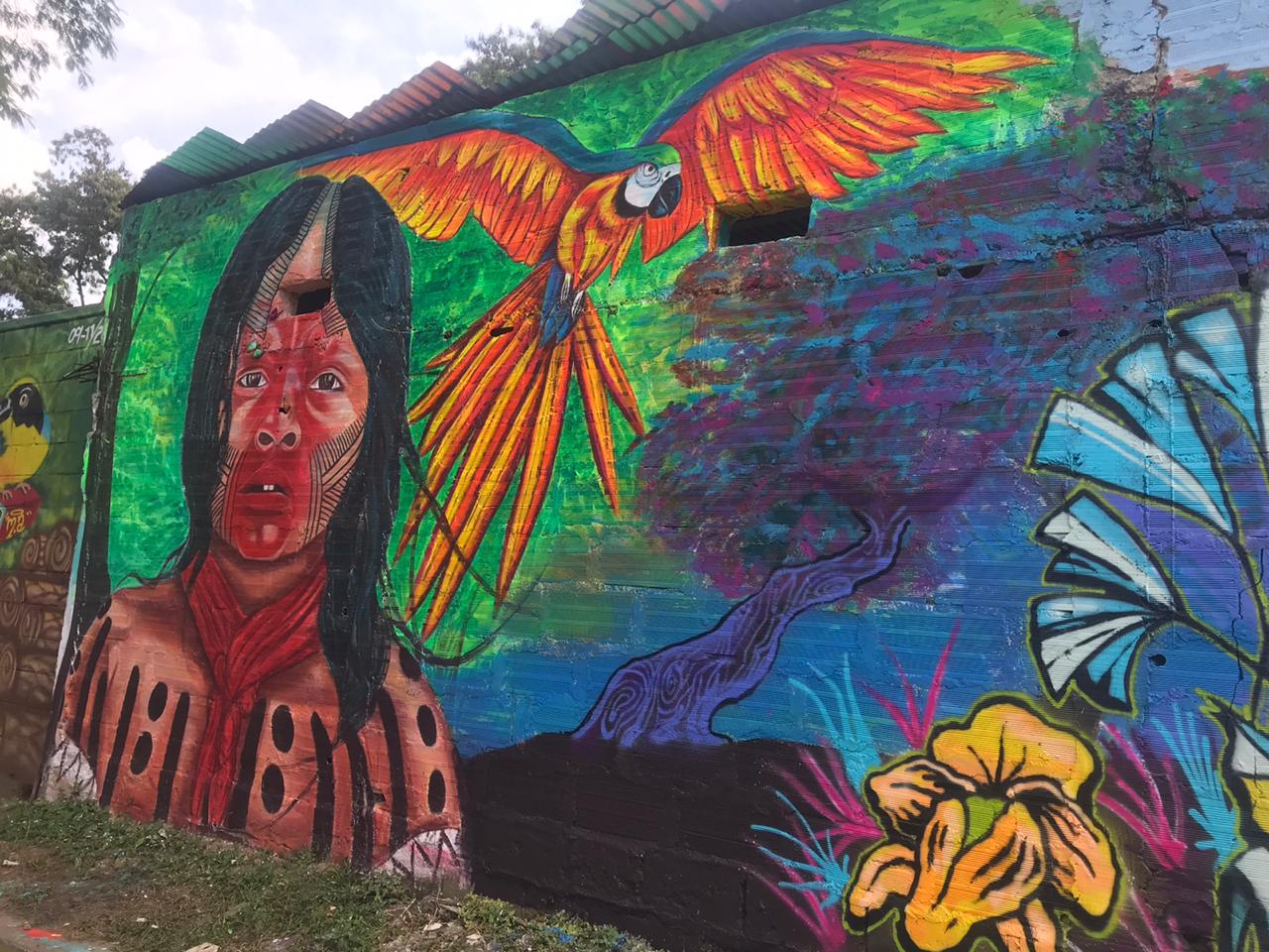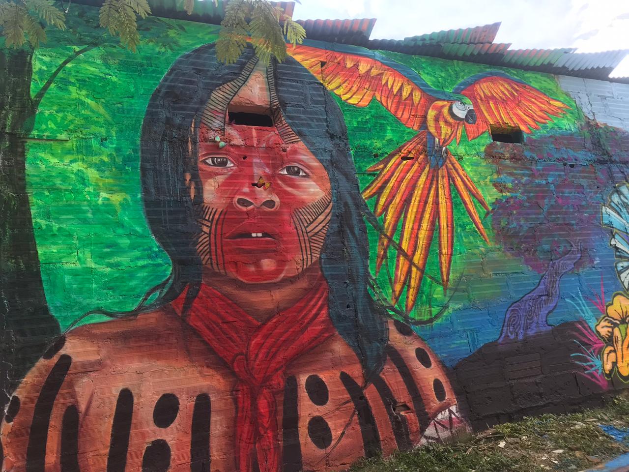 Una de las Obras seleccionadas en la Convocatoria “Intervención con arte urbano y graffiti en la calle Barranquilla” de Agencia App de Medellín.2020. Con una superficie de 3x4m. El nombre de la indígena es Ushe que traduce la madre tierra para el Amazonas. Es un llamado a la conservación, protección y elaboración de garantías para la diversidad cultural e histórica de Colombia