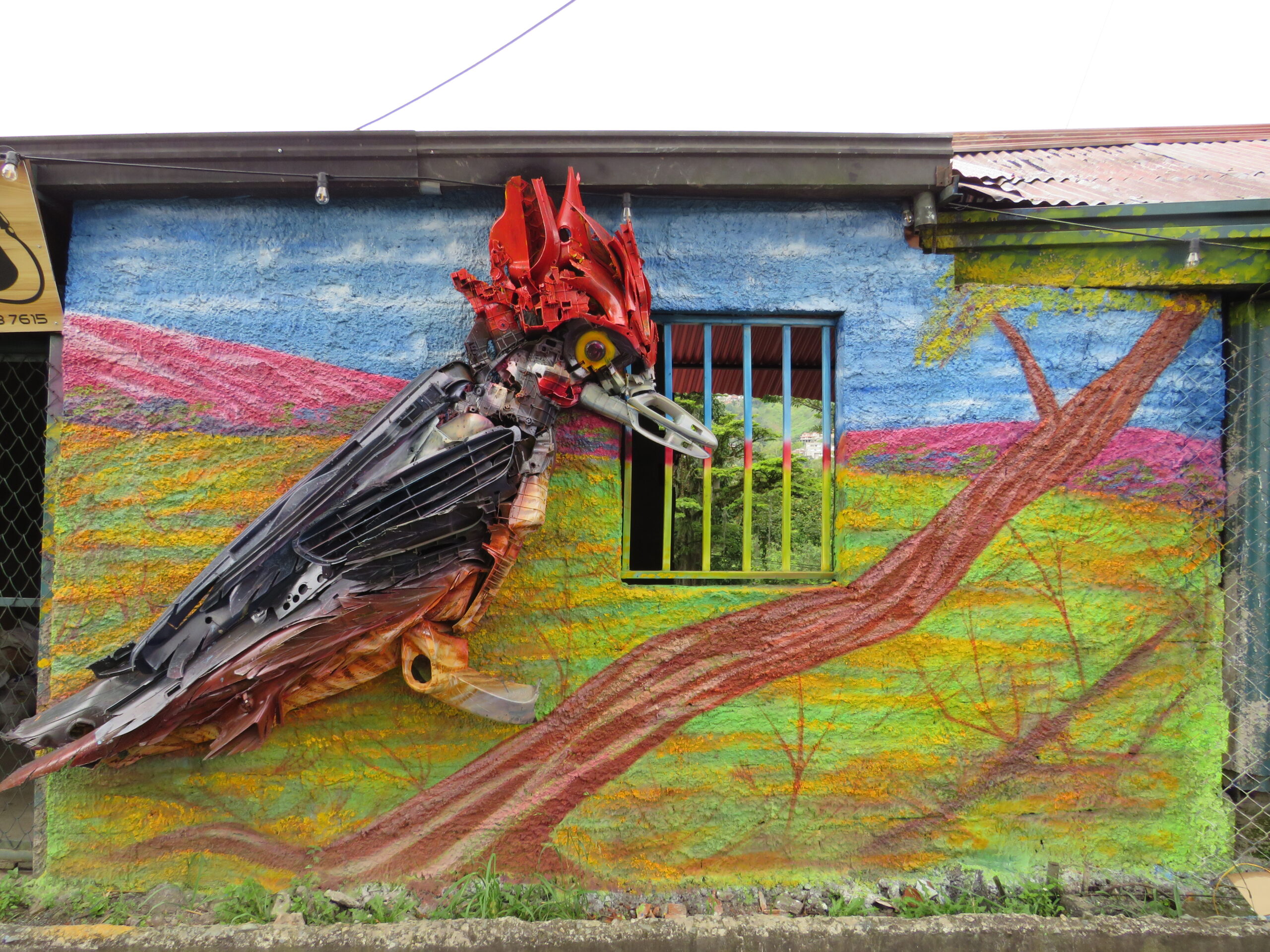 Descripción: Esmalte sobre muro con dos pájaros tridimensionales.