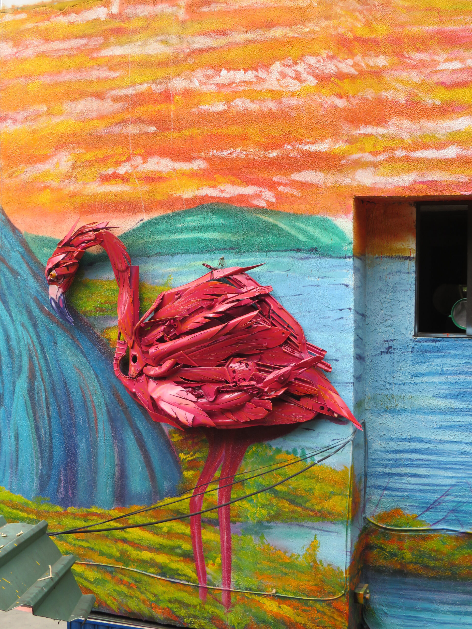 Detalle: Este trabajo incluye mural e instalación de dos piezas escultóricas hechas en plástico automotriz desechado