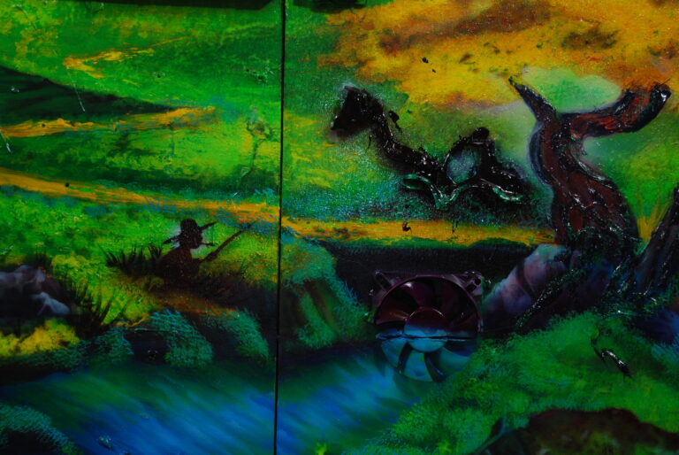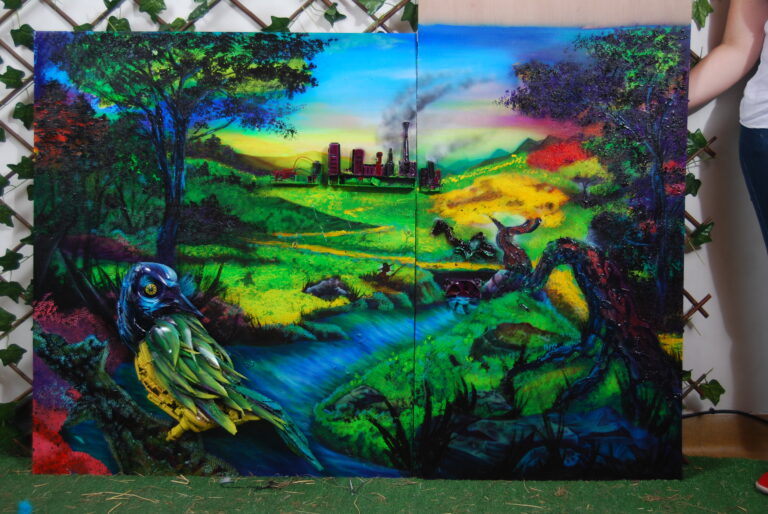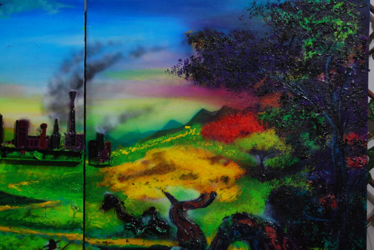 Descripción: Díptico, vínico, laca y material Plástico reciclado sobre MDF