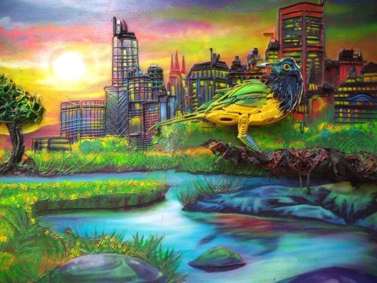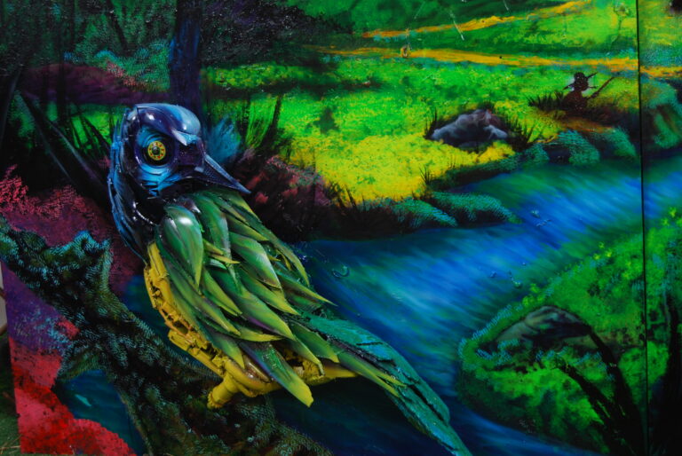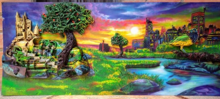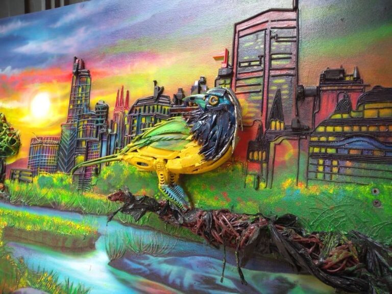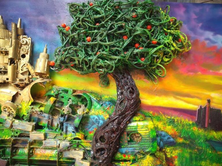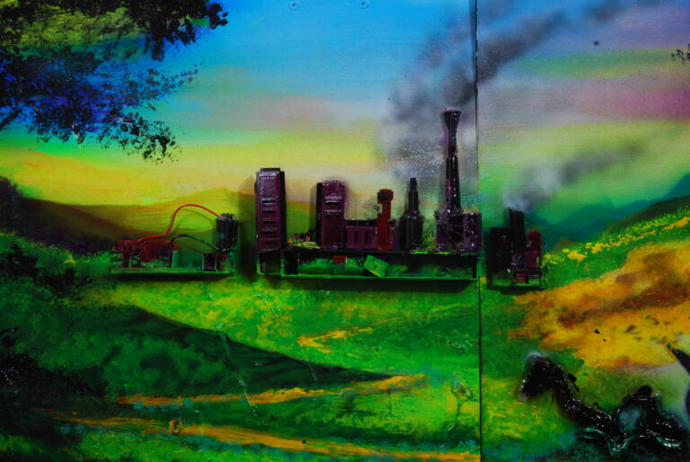 Descripción: Vinilo, laca y materiales reciclados sobre MDF