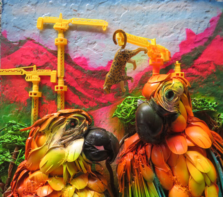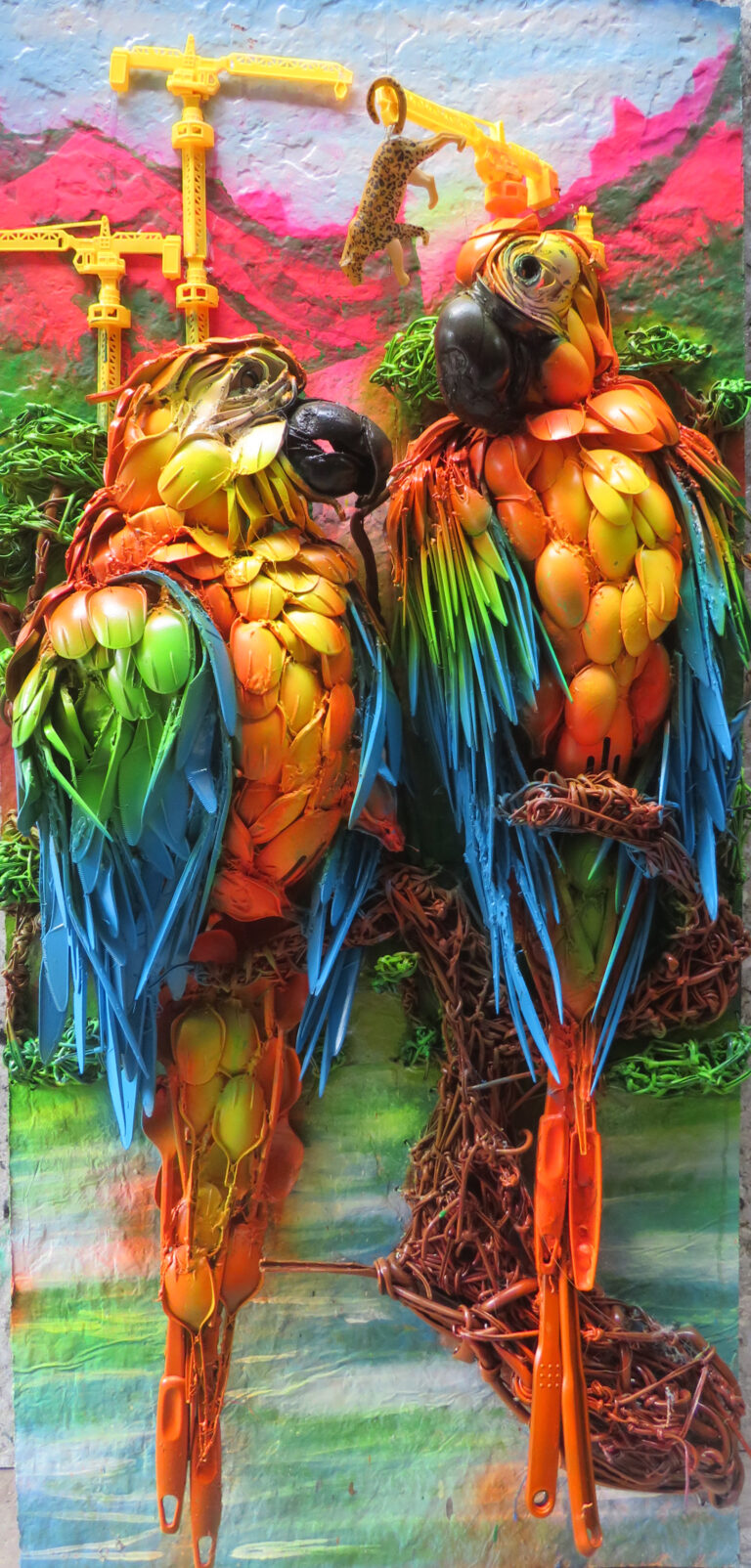 Dos guacamayas hechas en plástico de un solo uso (cucharas desechables), desecho electrónico (cables) y juguetes desechados. Sobre lámina de Tetrapack.
