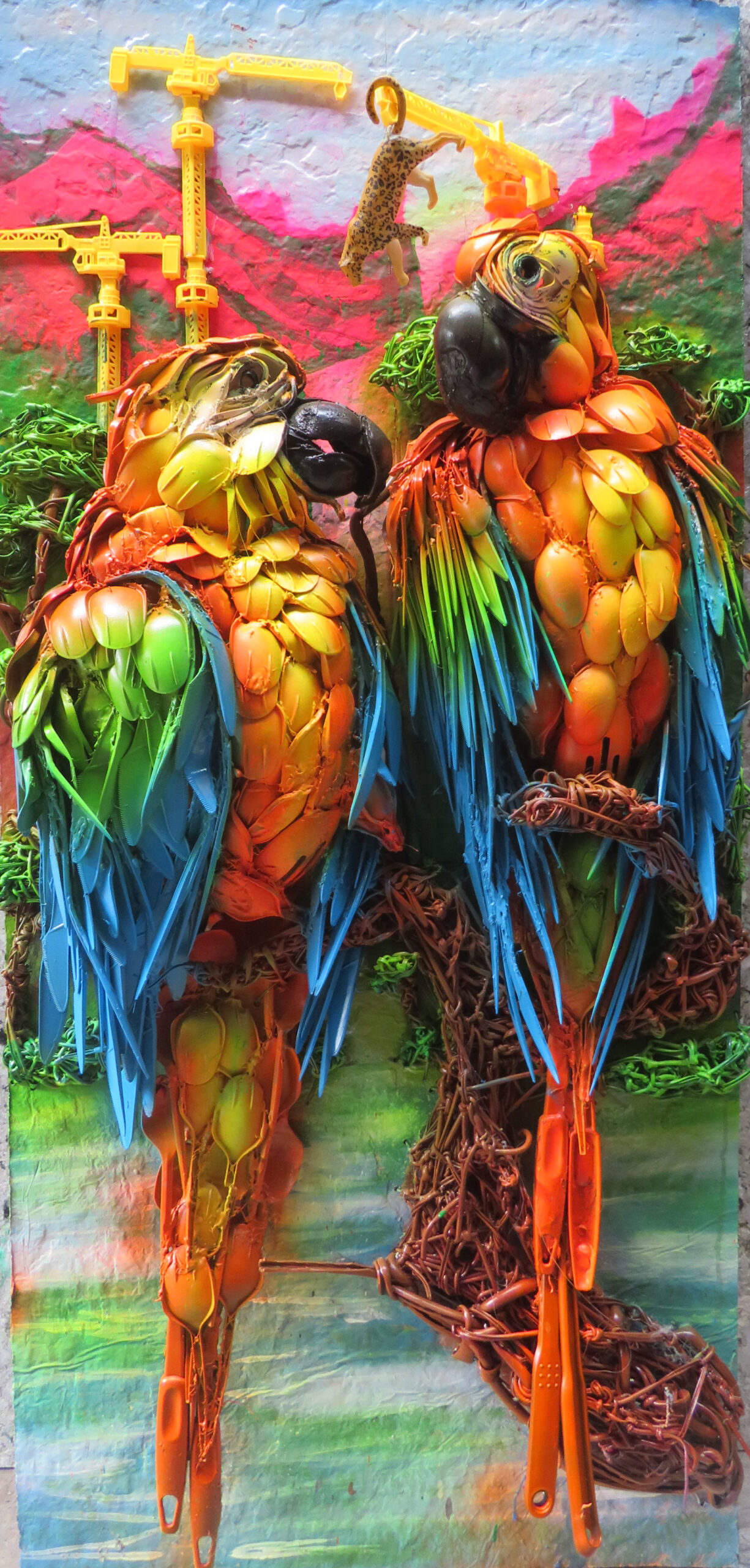 Dos guacamayas hechas en plástico de un solo uso (cucharas desechables), desecho electrónico (cables) y juguetes desechados. Sobre lámina de Tetrapack.
